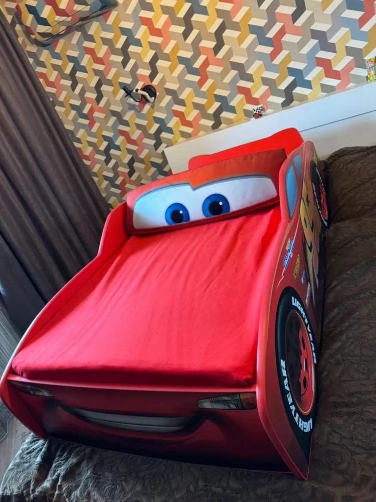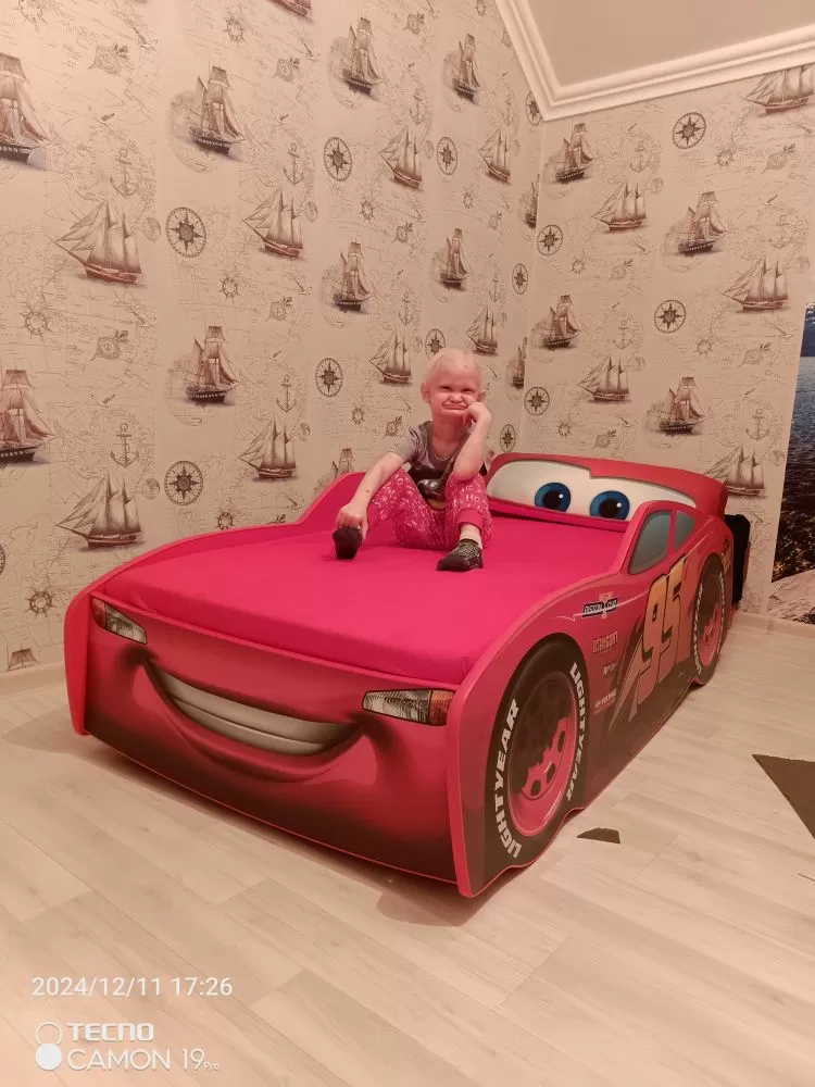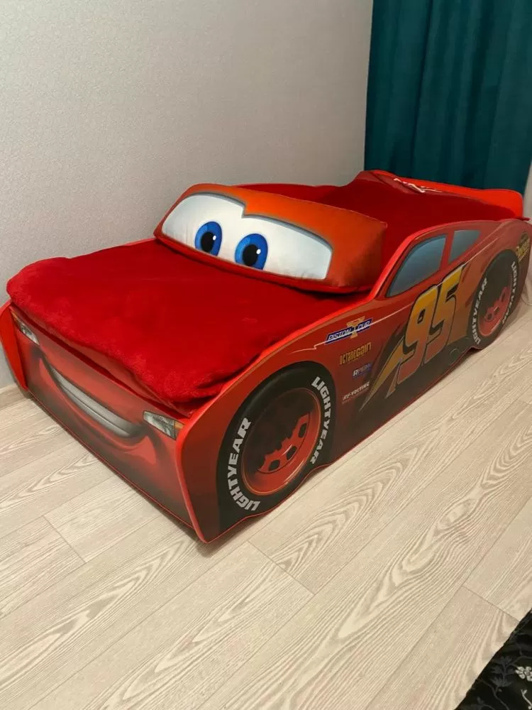Кровать-машина Молния Маквин является одним из главных персонажей любителей мультфильма “Тачки”. Кровать изготовлена из ЛДСП класса эмиссии Е-0,5, одобренной для производства детской мебели. Корпус декорирован наклейками для придания модели сходства с персонажем, края отделаны мягким кантом из соображений безопасности ребенка. Наклейки защищены от износа ламинированным покрытием. Все, включая скрытые элементы конструкции, закрыты пленкой ПВХ, и новая кровать почти не имеет фабричного запаха.