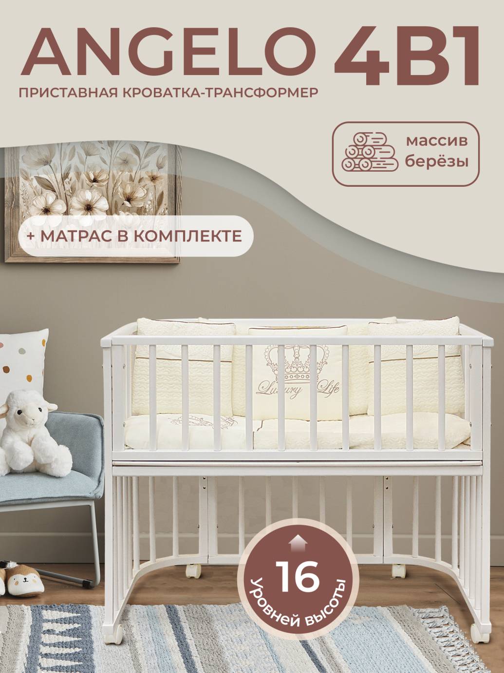 Представляем вам уникальную приставную кроватку-трансформер Sweet Baby Angelo 4в1, выполненную из высококачественного массива березы и МДФ, которая обеспечит вашему ребенку комфорт и безопасность с первых дней жизни. Эта кроватка для новорожденных предлагает 4 варианта трансформации: люлька, приставная кроватка, письменный стол для занятий и диванчик. Мягкий и удобный матрасик выполненный из высококачественных материалов в комплекте