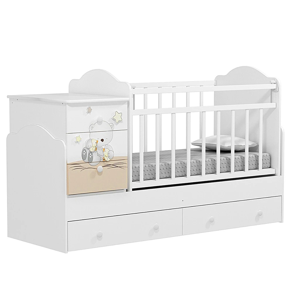 Сборка кровати возможна в двух вариантах: для малыша с рождения до 3-х лет и для дошкольника или подростка. В первом случае вы можете регулировать высоту ложа в 2-х положениях, а также использовать механизм опускания планки для удобного доступа к малышу. Второй вариант предусматривает увеличение спального места до 170 см в длину и снятие комода с основания для использования его как отдельной тумбы.