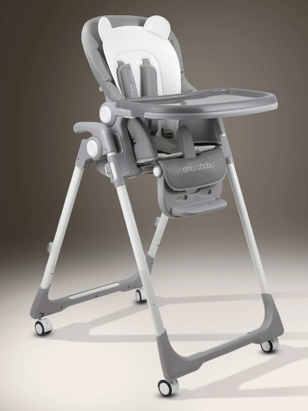 Спинка сиденья может быть отрегулирована в пять различных положений наклона. Чехол стульчика сделан из эко кожи. Для максимального комфорта малыша добавлен мягкий вкладыш в виде мишки, который можно снять и постирать.