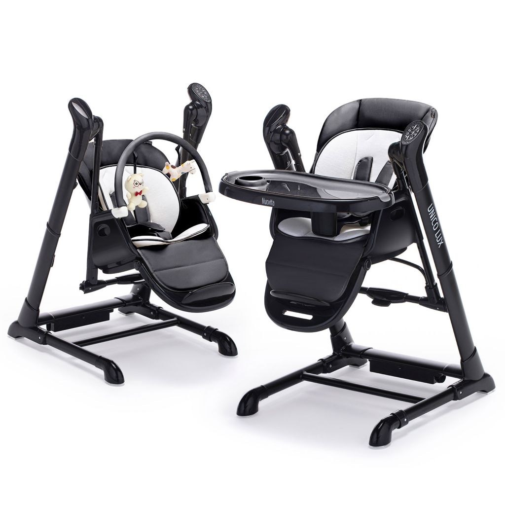 UNICO LUX от бренда Nuovita — это стульчик для кормления 2в1, который можно использовать как шезлонг и качели для грудничка. Он пригодится с самого рождения: шезлонг расположен высоко от пола, сиденье раскладывается в полулежачем положении, электронный механизм укачивает ребенка и проигрывает музыкальные композиции. Когда малыш подрастет, детский стульчик для кормления позволит усадить его за один стол со взрослыми или отдельно, чтобы он мог кушать на специальном столике, рисовать или играть.